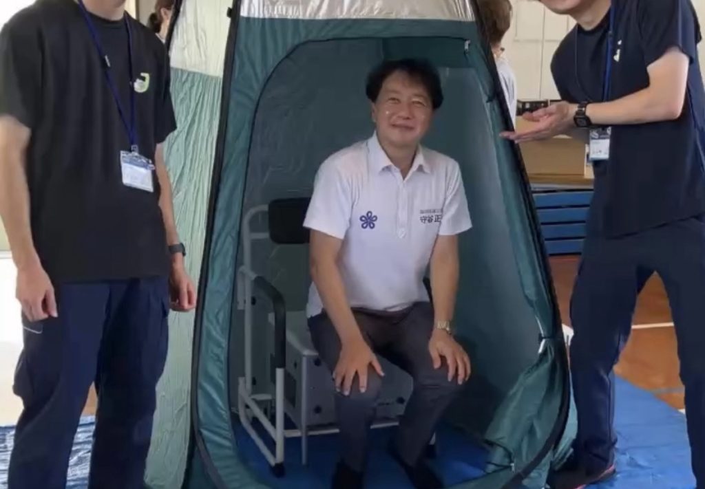 その後は避難所設営を行い、防災テント貼り、簡易トイレ作りなどが行われました。片江中学校の生徒の皆さんがテント針を実演してくれました。