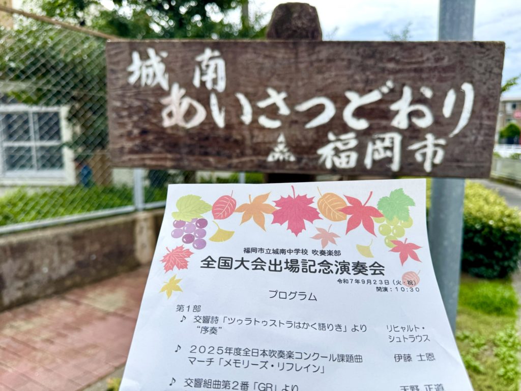 福岡市立城南中学校 吹奏楽部は「第70回九州吹奏楽コンクール」にて金賞を受賞し、九州代表として、10月18日に栃木県で開催の「第73回 全日本吹奏楽コンクール記念演奏会」へ出場(7大会連続)することとなりました。