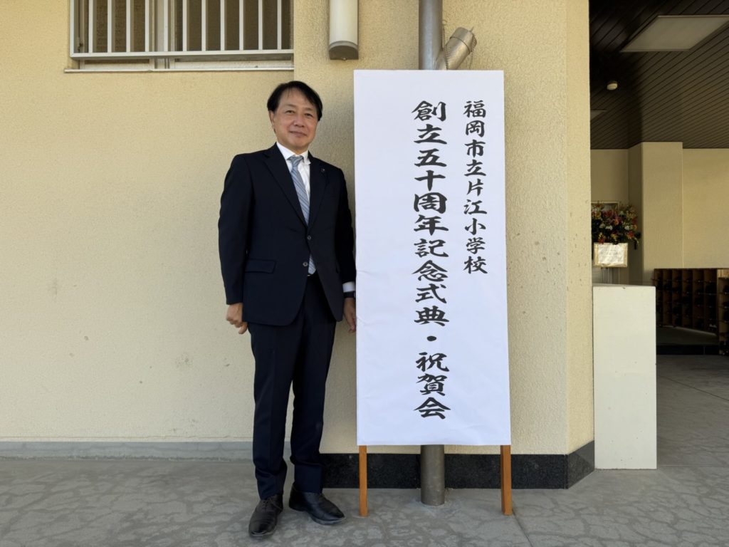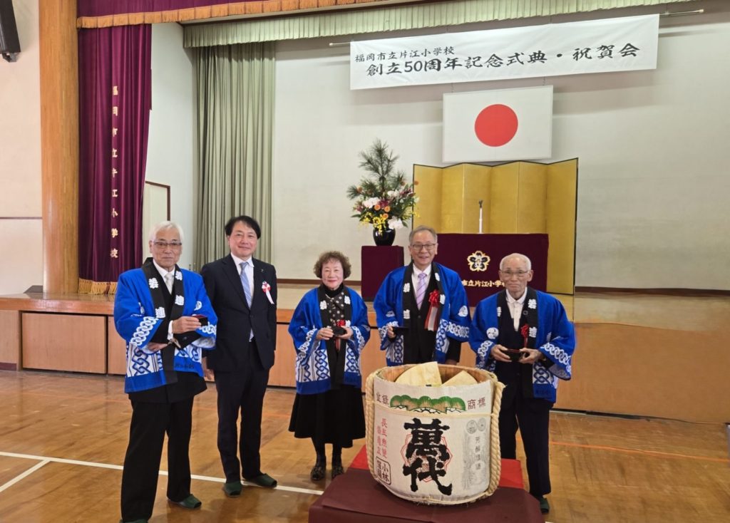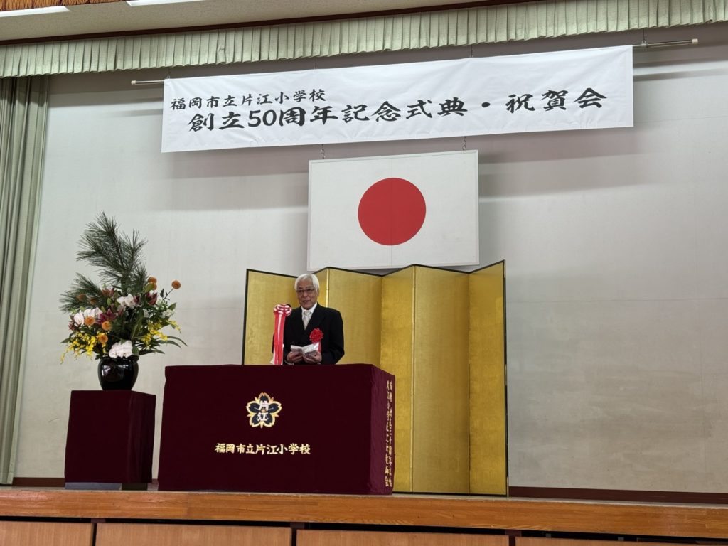 福岡市立片江小学校の創立記念の式典•祝賀会に参加しました。小学校の体育館には地域の方や歴代PTA、学校関係者など多数が集まりました。