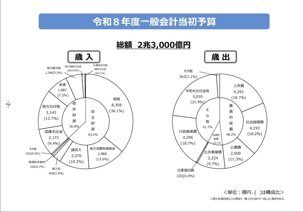 福岡県の令和8年年度当初予算案の一般会計の総額は2兆3000億円余と過去最大で、6年連続で2兆円を超え、一般会計の総額が過去最大となり、これまで最大だった令和7年度をおよそ1000億円余上回りました。新規事業は215件です。