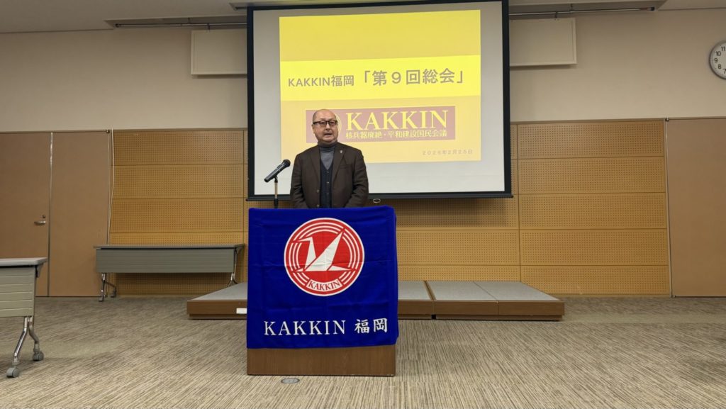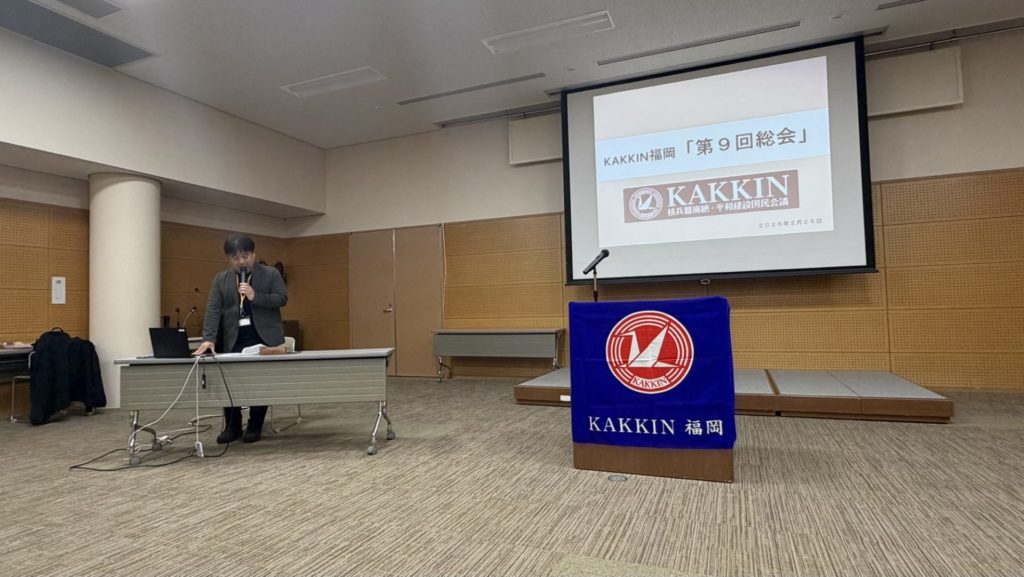 総会では西央人代表(UAゼンセン福岡支部支部長)からの挨拶の中でKAKKINの歴史や指針についてお話がありました。各平和団体との相違点やKAKKINの必要性についてあらためて理解が深まりました。