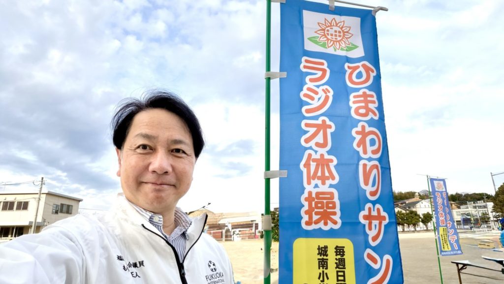 気候も良く気持ちの良い日曜日の今朝は、城南校区の「ひまわりサンデーラジオ体操」を訪問しました。今日もたくさんの校区の方々が城南小学校の校庭に集まりました。今日のラジオ体操は