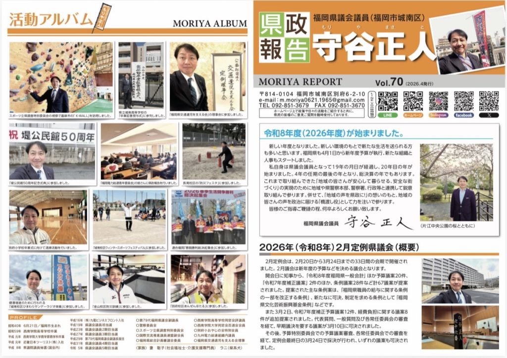 毎議会終了後に発行しています「守谷正人県政報告書」は今号で70号となりました。