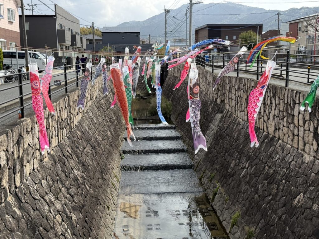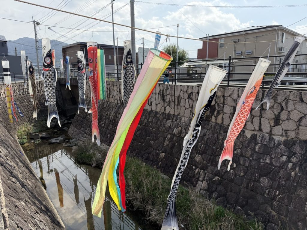 城南区の片江小学校の前を流れる片江川の上に片江校区の佐藤会長を始め地域の皆さんの手で鯉のぼりが設置されました。 春の清々しい風に、たくさんの鯉のぼりが気持ちよく泳いでいました。 子供達の健やかな成長などを地域のみんなで一緒に祈念しました。